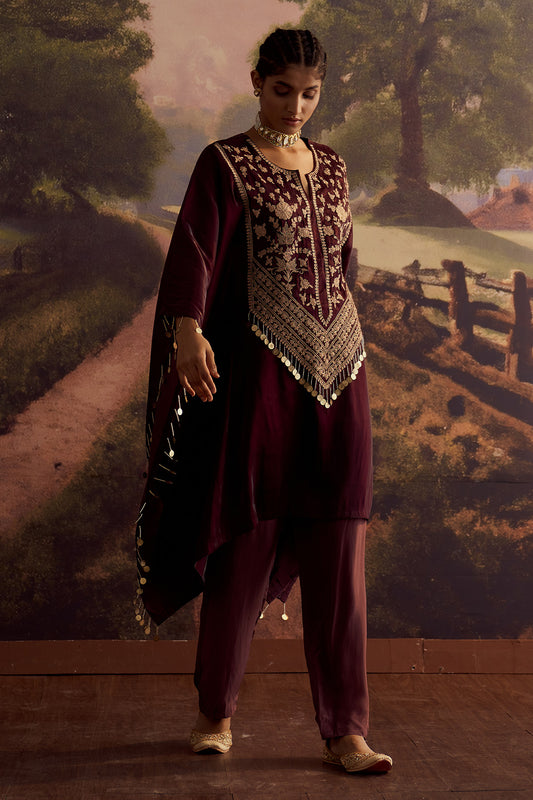 Saanjh Velvet Kurta Set-Maroon