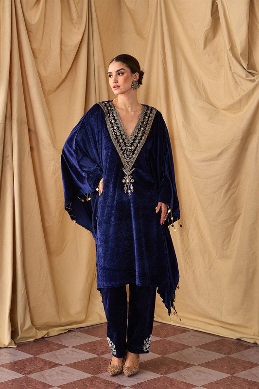 Sikka Velvet Zari Blue Kaftan Set