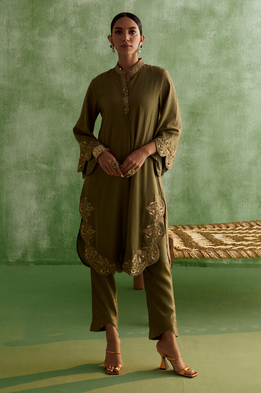 INARA ZARI-DAMAN KURTA SET -OLIVE GREEN